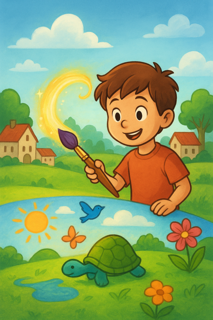 Le village entier devint joyeux 🎉. Tous aimaient Adam, qu’ils appelaient désormais « l’enfant au pinceau magique » 👑.